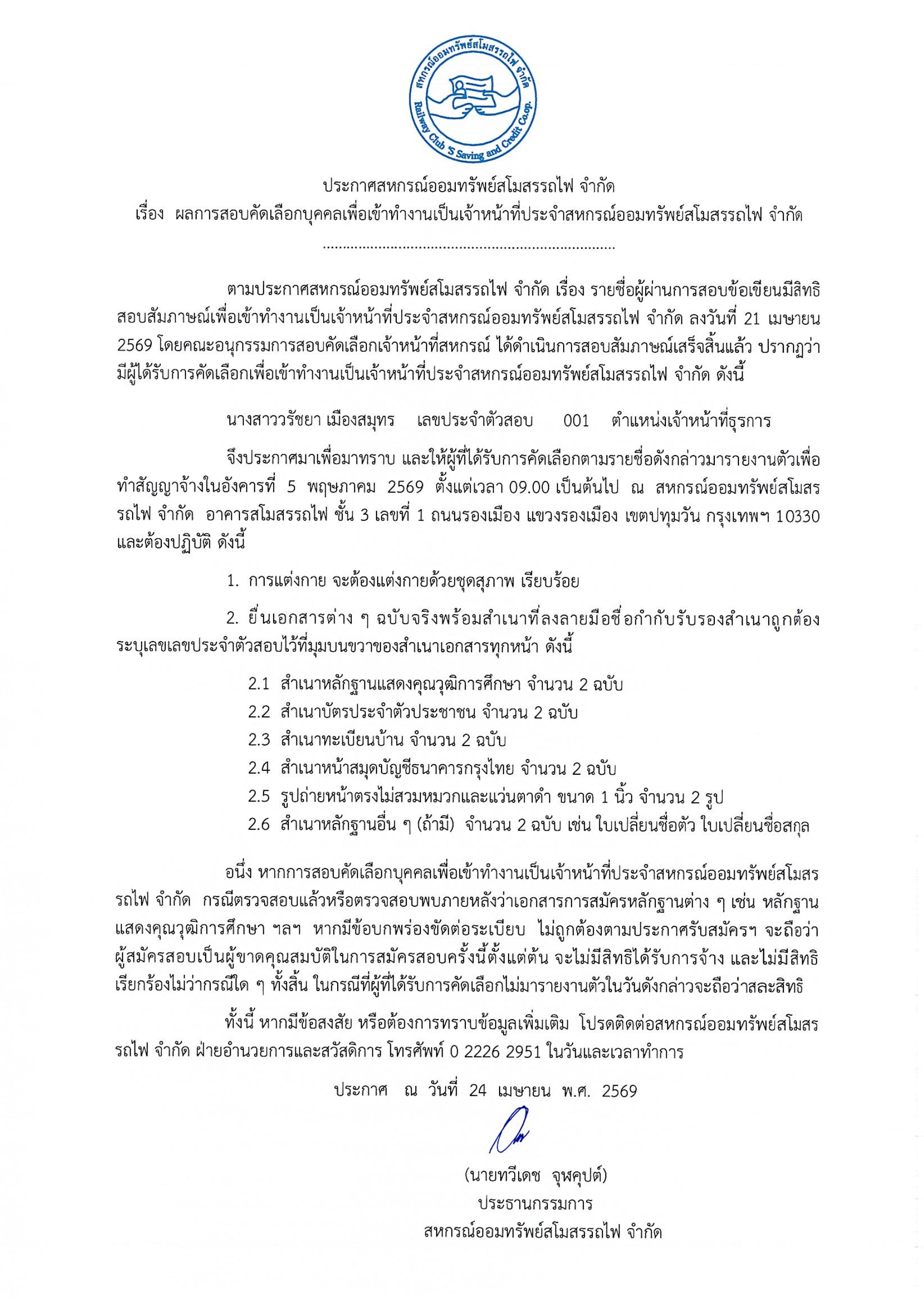 อ่านต่อ คลิ๊กตามที่ได้มีประกาศสหกรณ์ออมทรัพย์สโมสรรถไฟ จำกัด ลงวันที่ 23 มีนาคม 2569 เรื่องรับสมัครเจ้าหน้าที่สหกรณ์ จำนวน 2 ตำแหน่ง โดยให้ผู้สนใจยื่นใบสมัครตามแบบที่สหกรณ์กำหนด พร้อมเอกสารหลักฐานประกอบการรับสมัคร ระหว่างวันที่ 23-30 มีนาคม 2569 นั้น บัดนี้การรับสมัครดังกล่าวได้ดำเนินการเสร็จสิ้นแล้ว ...อ่านต่อ